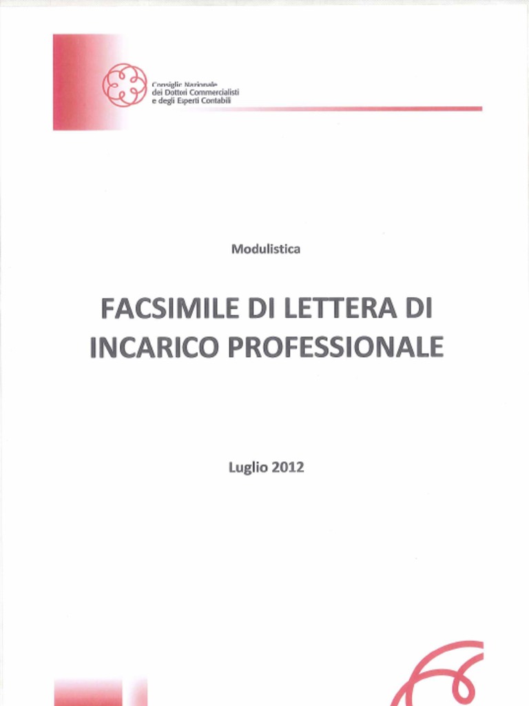 DOC Facsimile Di Lettera Di Incarico Professionale Il MODELLO di lettera di incarico professionale è stato redatto facendo esplicito richiamo sia a quanto previsto dalle norme del Codice Civile, dal Codice deontologico, dalle indicazioni del Consiglio Nazionale nonché dalla Tariffa professionale e da tutte quelle norme che hanno rilevanza per la nostra Professione.