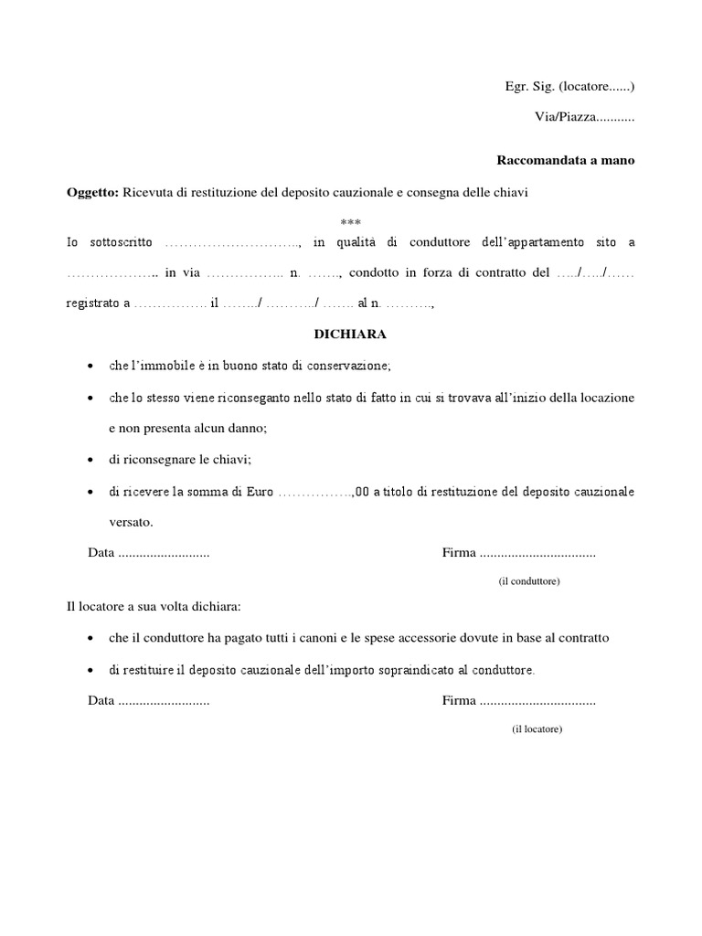 Richiesta di Restituzione della Caparra - Modello La caparra, o deposito cauzionale, serve a garantire al locatore (proprietario), durante un contratto di locazione (affitto), la sicurezza di avere del denaro o altro bene da parte del conduttore (inquilino), utile nel caso in cui quest'ultimo non adempiesse ai suoi obblighi di pagamento del canone dello stesso. PDF Ricevuta Di Restituzione Del Deposito Cauzionale E Consegna Delle ... • che lo stesso viene riconsegnato nello stato di fatto in cui si trovava all'inizio della locazione e non presenta alcun danno; • di riconsegnare le chiavi; • di ricevere la somma di Euro _____,00 a titolo di restituzione del deposito cauzionale versato. Il Sig. _____, in qualità di LOCATORE, DICHIARA: