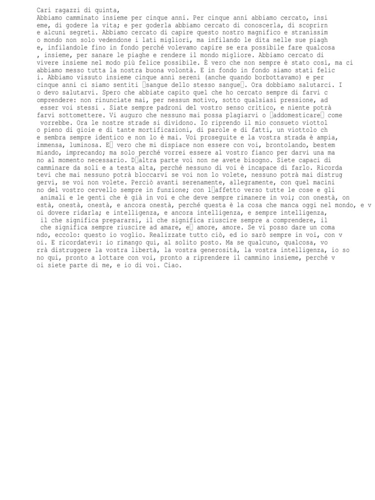 Alberto Manzi - Lettera agli alunni di quinta elementare: Padroni del ... Nel 1976 il maestro Alberto Manzi scrive una lettera ai suoi studenti di quinta, quella lettera viene riproposta nel sito di Comune.info in un post del 24 giugno 2014. Molto meglio di un programma ministeriale e di una programmazione didattica. ... (Manzi, lettera agli alunni di quinta elementare, 1976) La lettera agli alunni della quinta ... Lettera del maestro Alberto Manzi ai suoi alunni di quinta Ma se qualcuno, qualcosa vorrà distruggere la vostra libertà, la vostra generosità, la vostra intelligenza, io sono qui, pronto a lottare con voi, pronto a riprendere il cammino insieme, perché voi siete parte di me, e io di voi.". Lettera del maestro Alberto Manzi ai suoi alunni di quinta. Pubblicato da Guamodì Scuola alle 18:04. La lettera che tutti dovrebbero ricevere | Luca Chiesi Lettera ai ragazzi di quinta (del maestro Alberto Manzi) "Cari ragazzi di quinta, abbiamo camminato insieme per cinque anni. Per cinque anni abbiamo cercato, insieme, di godere la vita; e per goderla abbiamo cercato di conoscerla, di scoprirne alcuni segreti. Abbiamo cercato di capire questo nostro magnifico e stranissimo mondo non solo vedendone i lati migliori, ma infilando le dita nelle ...